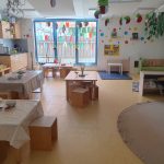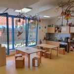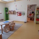 Die hellen, mit großen Fensterbereichen ausgestatteten Räumlichkeiten unserer Einrichtung befinden sich im Erdgeschoss des ehemaligen Guggomos-Firmengeländes in der Schlossmühlstraße und bieten ausreichend Platz für zwei Kindergartengruppen und eine Krippengruppe. Letztere liegt, ein wenig abseits der übrigen Gruppen hinter dem Leitungsbüro und dem Personalraum. Neben-, bzw. Schlafraum sowie ein großzügiger Hygiene- und Wickelbereich grenzen direkt an den Gruppenraum an. Einen separaten Raum zum Abstellen von Kinderwägen gibt es unmittelbar gegenüber des Gruppenraums.