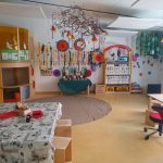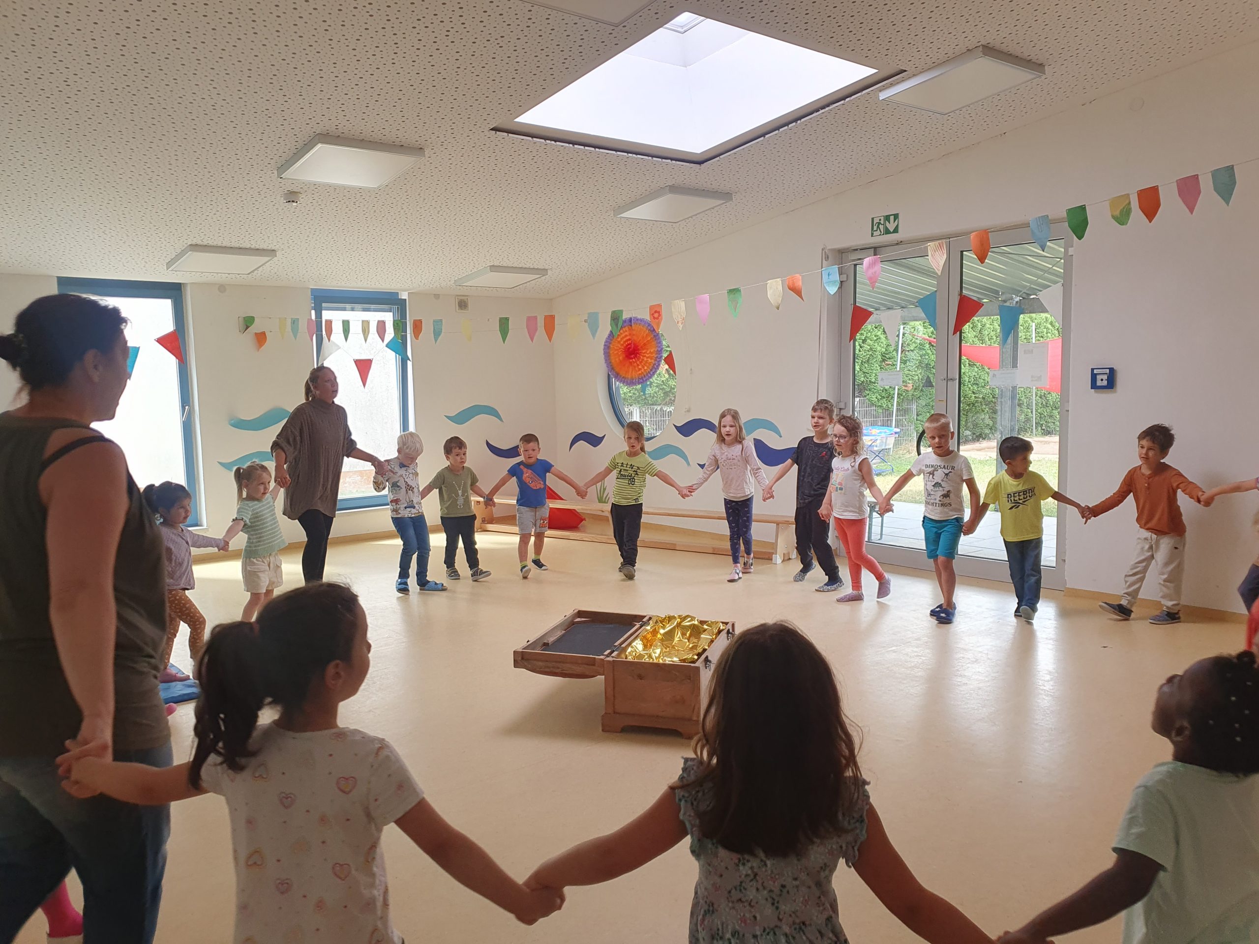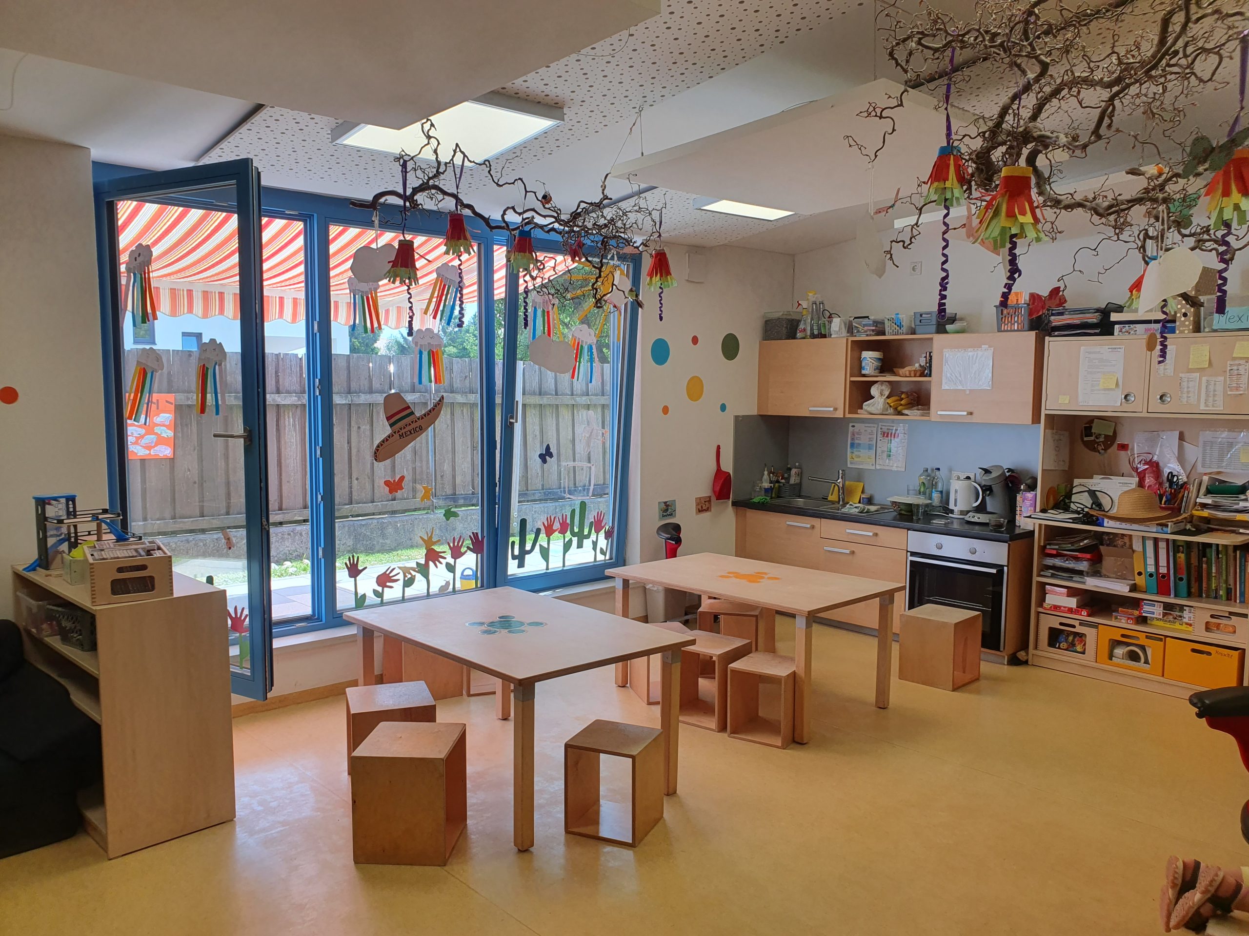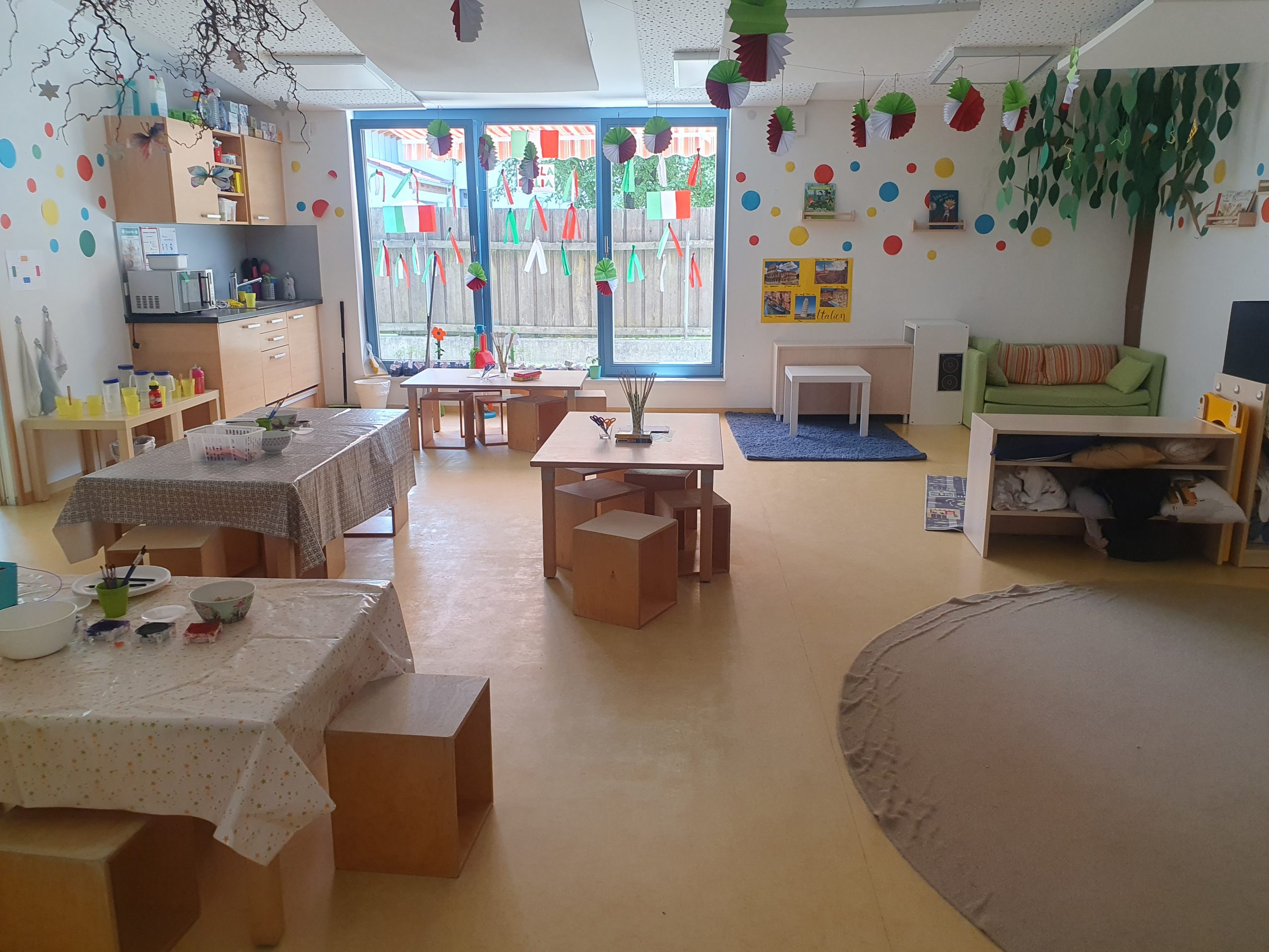 Die beiden Kindergartengruppen sind durch einen Zwischenraum miteinander verbunden. Dieser wird, je nach Situation der Kinder entsprechend angepasst und ist entsprechend Atelier, Musikzimmer oder Entspannungsraum. Auch für die Kindergartengruppen gibt es einen großen Hygiene- und Toilettenbereich sowie eine großzügig dimensionierte Turnhalle. Auch ein separater Küchenbereich ist vorhanden. Der für alle Kinder der Einrichtung ausgelegte Garten bietet mit Sandkasten, Schaukeln, Klettergerüst und Hügeln viele Möglichkeiten und ausreichend Platz um dem Bewegungsdrang der Kinder gerecht zu werden.